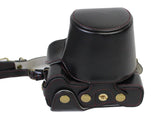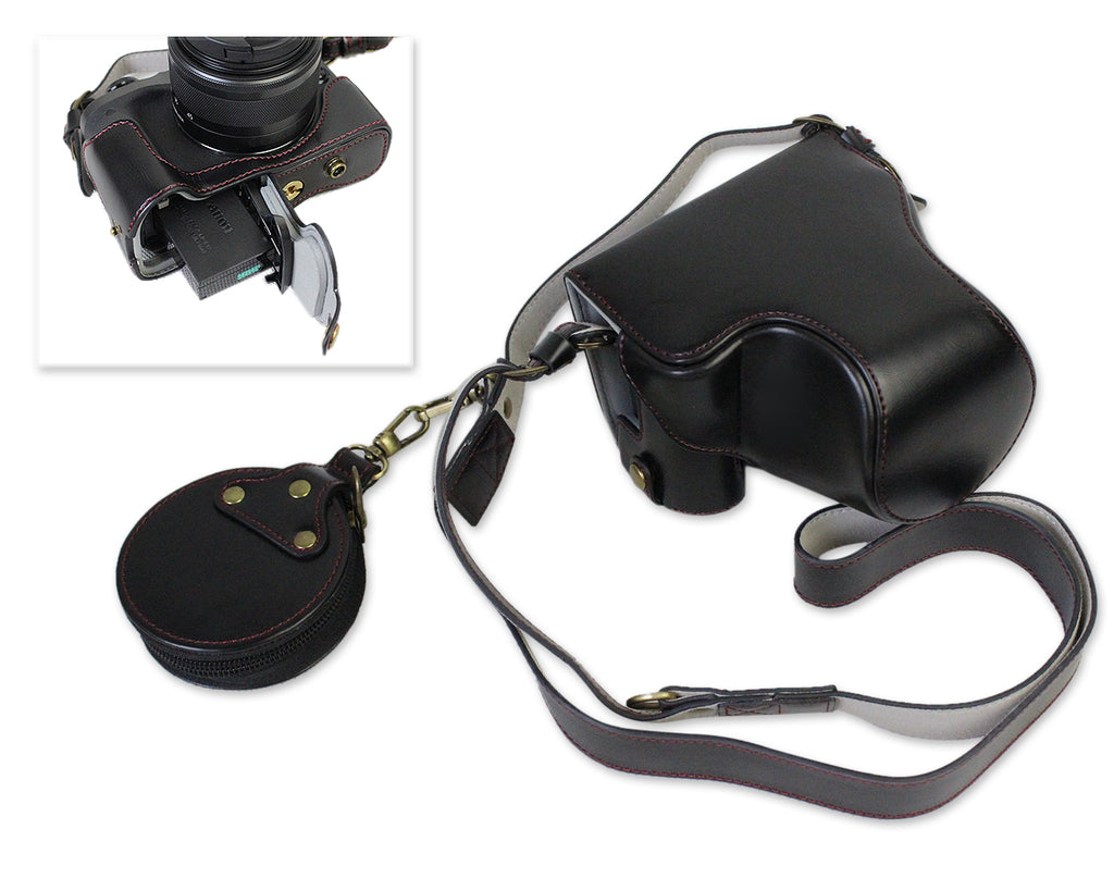 This Bottom Opening Canon EOS M6 Camera Leather Case is specially designed for Canon EOS M6 cameras with 15-45mm lens. The bottom of case can be open to replace battery or connect to computer. A tripod socket is added at the bottom of case, tripods can be used without removing the case. A camera strap included for carrying this case..